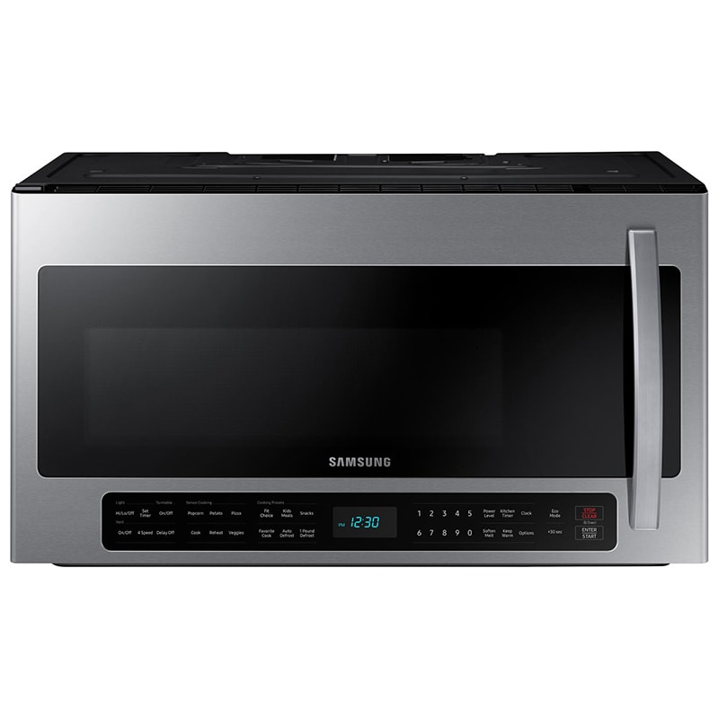 Samsung Me21r7051ss 2 1 Cu Ft Over The Range Microwave With Sensor Cook Large Capacity 400 Cfm Ventilation Ceramic Enamel Interior Led Cooktop Light Led Display Preset Options Eco Mode And 10 Power Levels Stainless Steel